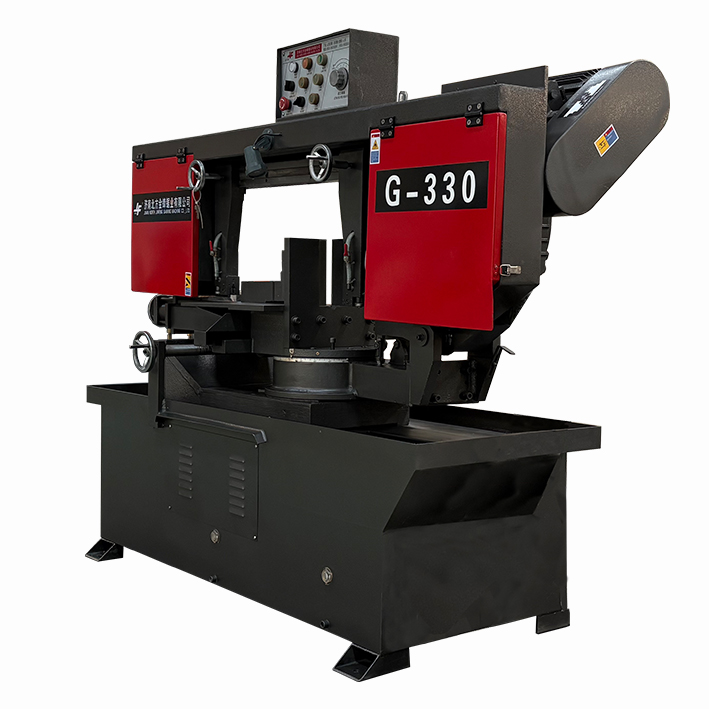 G-330是一款小型旋轉角度鋸床,在切割物料時,所切割的物料不動,鋸架可正向旋轉0°-45°或反向旋轉0°-60°,適合鋸切有角度要求的各類角鋼、圓鋼、矩形管等。這款鋸床引進和吸收國外同類鋸床的性能特點,液壓平衡油缸,高強度平衡彈簧及液壓無極調速,實現高效、精準鋸切。本機擁有精巧緊湊的外觀設計,有效減少對車間面積的占用。同時,其輕量化結構確保了搬運移動便攜,可根據生產需求靈活部署。G-330角度鋸床還可選配數控轉角,自動送料系統,實現自動化切割,不僅節省了人力,還使鋸切更加精確、生產效率大大增加。
