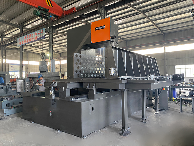 本鋸床的工作臺分為內工作床臺與外工作臺,內工作臺主要承載鋸切掉的余料,外工作臺主要承載工件。固定工件后鋸架開始定位切割,鋸架的移動采用齒輪齒條驅動,Y軸雙螺桿推進(一臺伺服帶動兩臺減速機同步進給)方向定位切割位置,X軸方向鋸切。導向精度高,運轉靈活,變頻器控制,調節方便,啟動無沖擊,鋸床的主傳動系統、液壓張緊系統、導向系統均安裝在鋸架上,所有線軌和螺桿做防護,配有手動油泵潤滑裝置,能有效延長鋸條、減速機、鋸輪等傳動部件的使用壽命。
